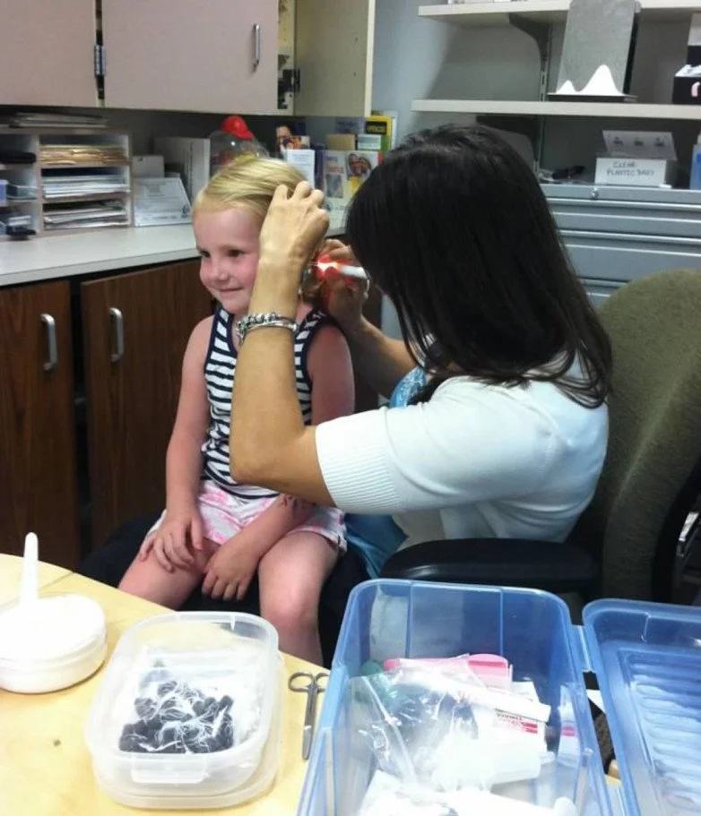 The author, now in high school, getting ear molds for her first pair of hearing aids at age 4.