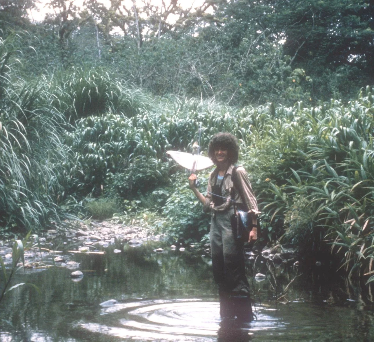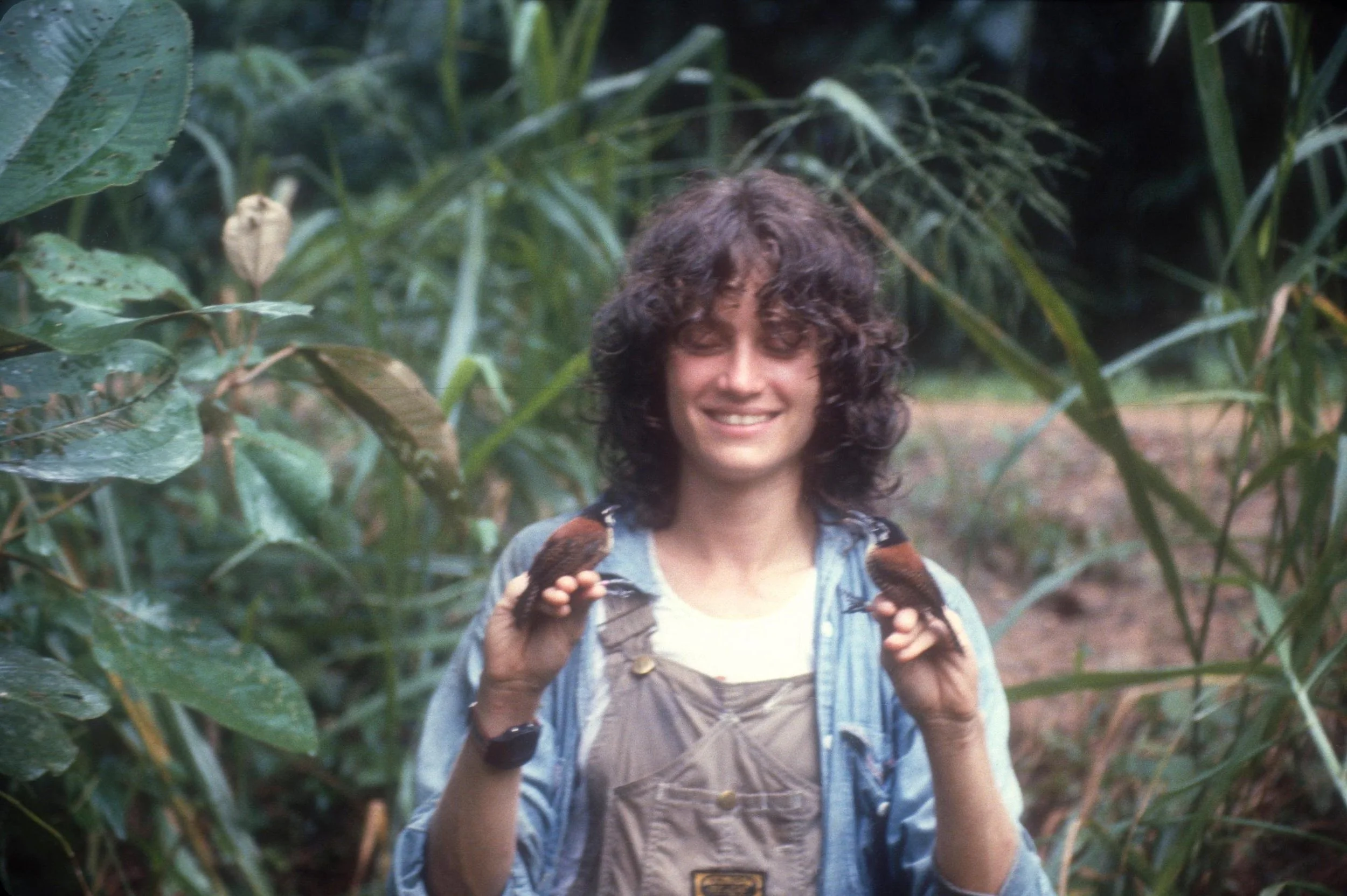 Dr. Levin during her dissertation work in Panama. She says she is “soaked but triumphant after finally successfully trapping an elusive pair of duetting wrens” (above), so she could give them color bands for individual identification and release them, and with her recording equipment in the jungle (below).
